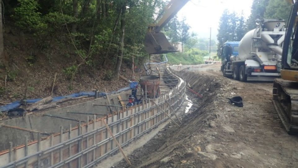 | 工事概要 | 復旧延長(左岸)L=18.9m、復旧延長(右岸)L=23.8m、 1号コンクリートブロック積工(間知ブロック)A=80.0m2、 2号コンクリートブロック積工(間知ブロック)A=72.0m2、現場打擁壁工(小口止工)N=8箇所 |